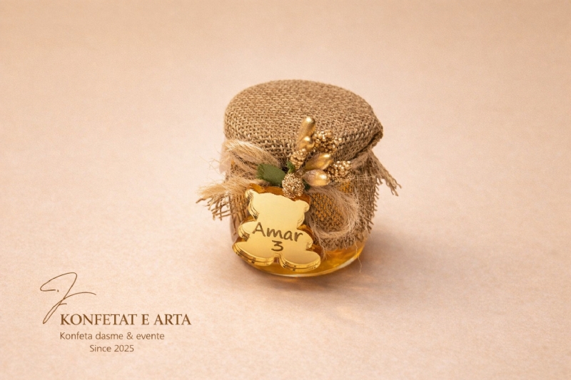 KONFETAT E ARTA ofron kavanozë mjalti me logo të personalizuar, emër dhe datë eventi, të përgatitur me kujdes në çdo detaj.