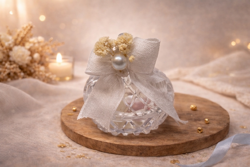 Kavanoz Dekorativ për Fejesa dhe Dasma me Fjongo të Bardhë dhe Perla, Konfete Elegante nga KONFETAT E ARTA, konfeta aristokratike per martese, dhurata high end per evente VIP, paketim me finiture luksoze, sete elitare ceremoniale